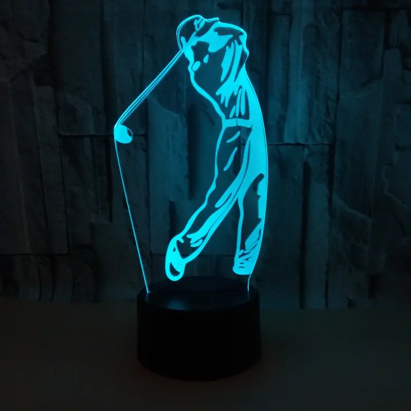 Denne 3D lampe er lavet af et optisk fladt akryl panel med laserindgravering, som giver en fantastisk 3D visuel effekt af en cool lysende golfspiller.