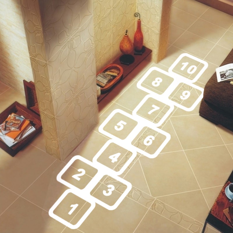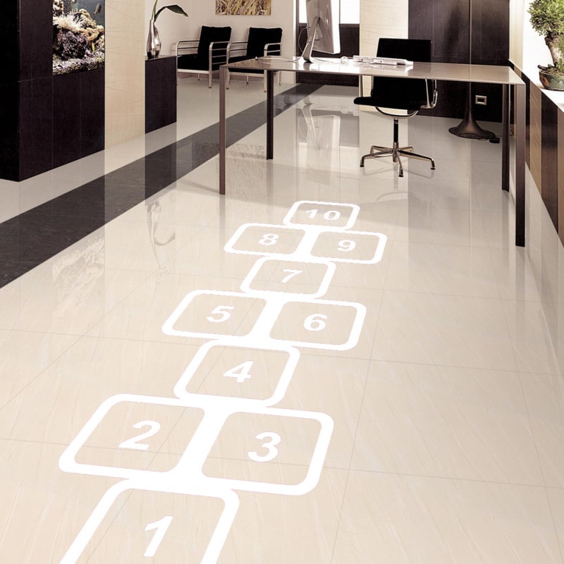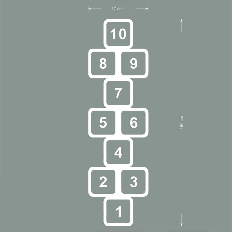 Fantastisk flot floorsticker som hinkerude i hvid, til leg, bevægelse og indendørs aktivitet.