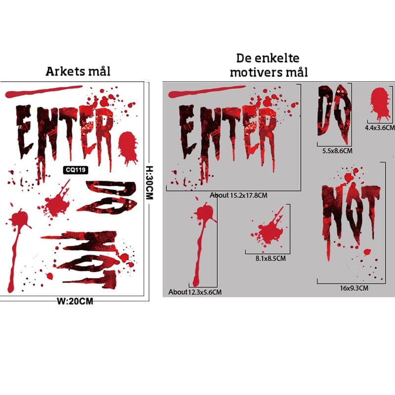 De realistiske blodstænk, håndaftryk og skræmmende beskeder som “HELP” og “DO NOT ENTER” sikrer, at dit hus skiller sig ud med en uhyggelig og frygtindgydende atmosfære.