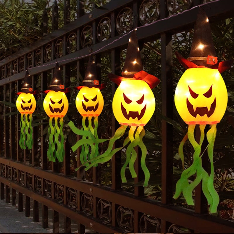 De 5 store græskarhoveder, hver med en heksehat, lyser op og skaber en hyggelig, men skræmmende atmosfære.