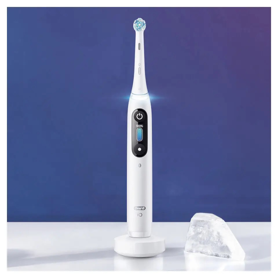 Oral-B iO Series 8N. Formål: Voksen, Tandbørste type: Vibrerende tandbørste, Tandbørstningstilstande: Daglig pleje, Gum pleje, Intens, Sensitiv, Super sensitive, Blegning. Strømkilde: Batteri, Batteritype: Indbygget batteri. Pakketype: Kasse. Antal medfølgende håndtag: 1 stk, Børstehoveder medfølger: 1 stk