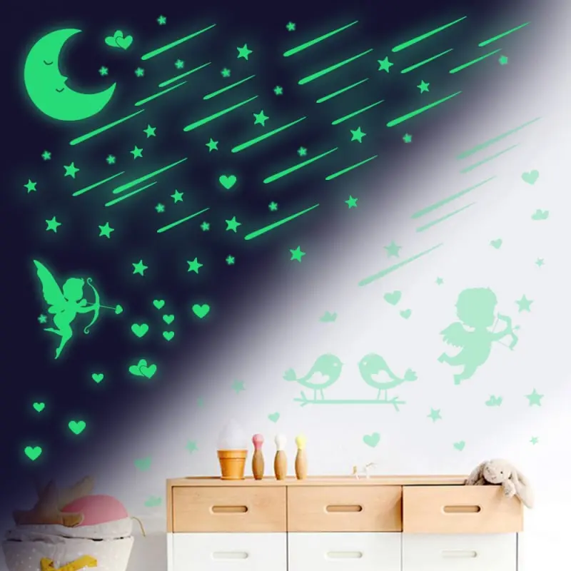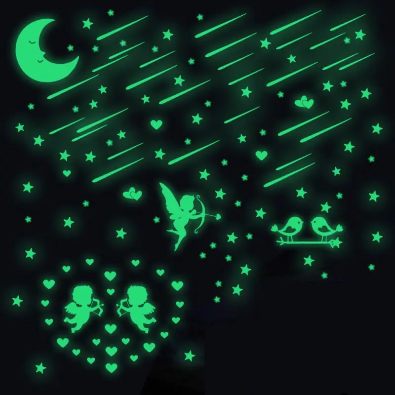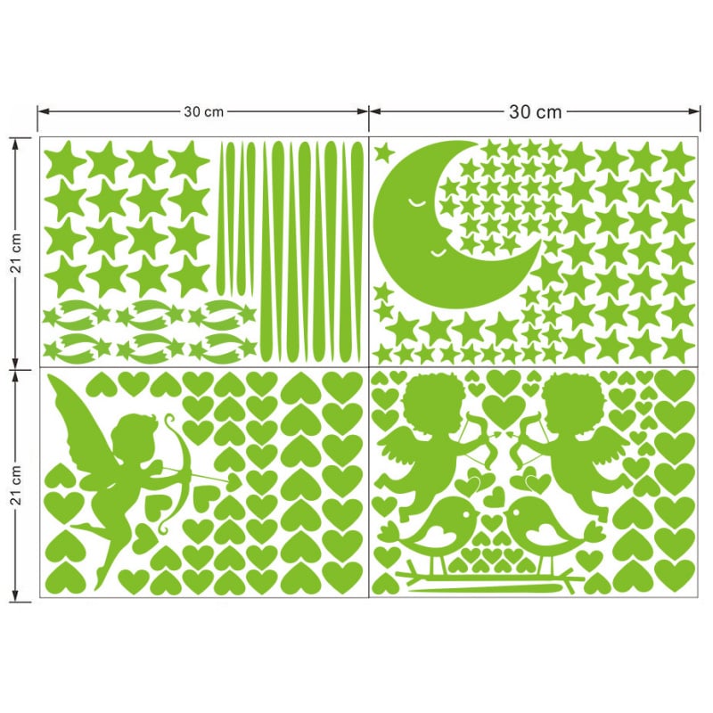Meget dekorativ selvlysende wallsticker der giver dig mulighed for at dekorere (næsten) hele værelset med en flot halvmåne, engle der skyder med Amors pil, to turtelduer, nogle stjerneskud samt masser af stjerner i forskellige størrelser.