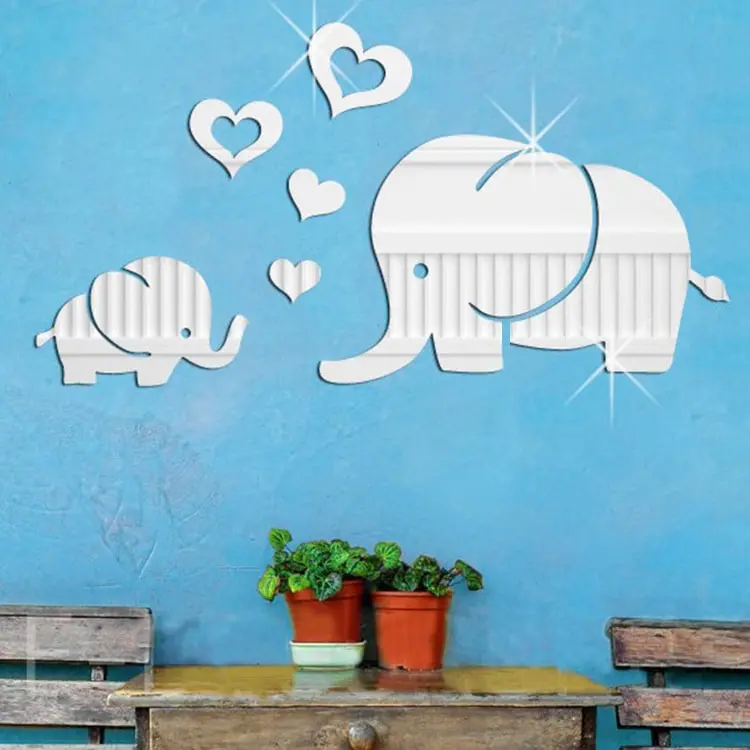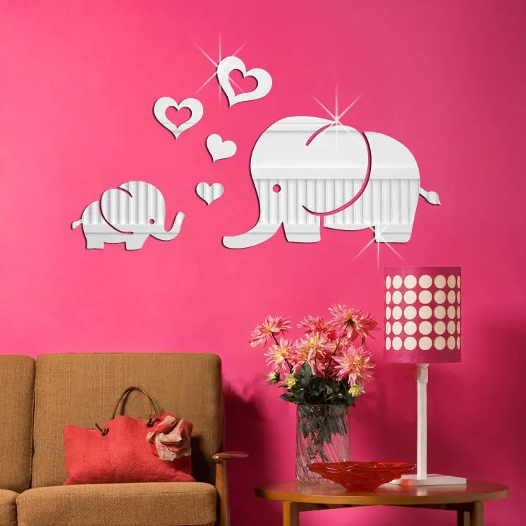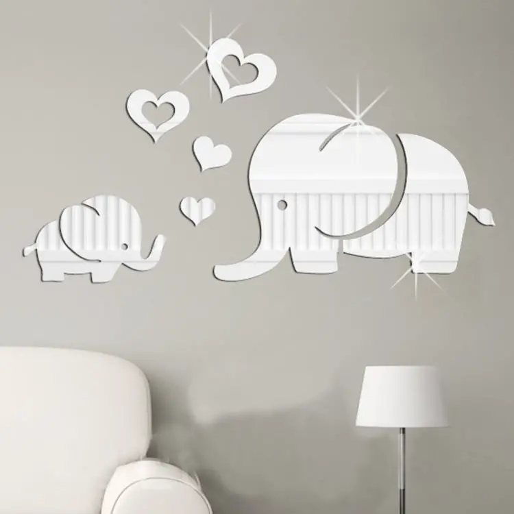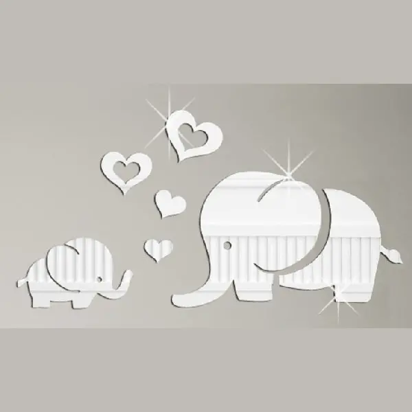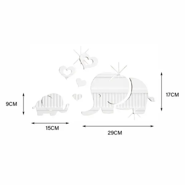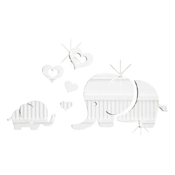 Rigtig flot og elegant akryl spejl klistermærke med to søde elefanter samt 4 hjerter, til at montere lige hvor det skal være – uden at skule bore 100 huller.