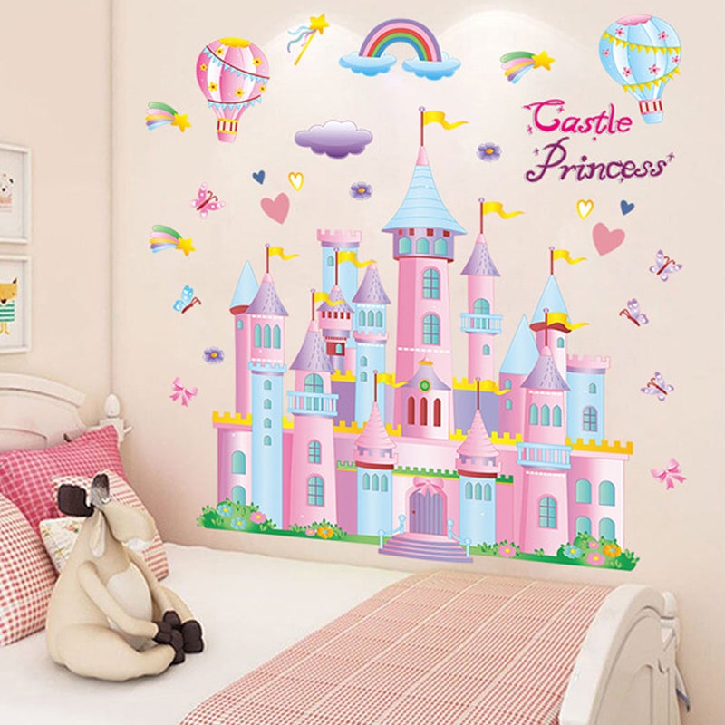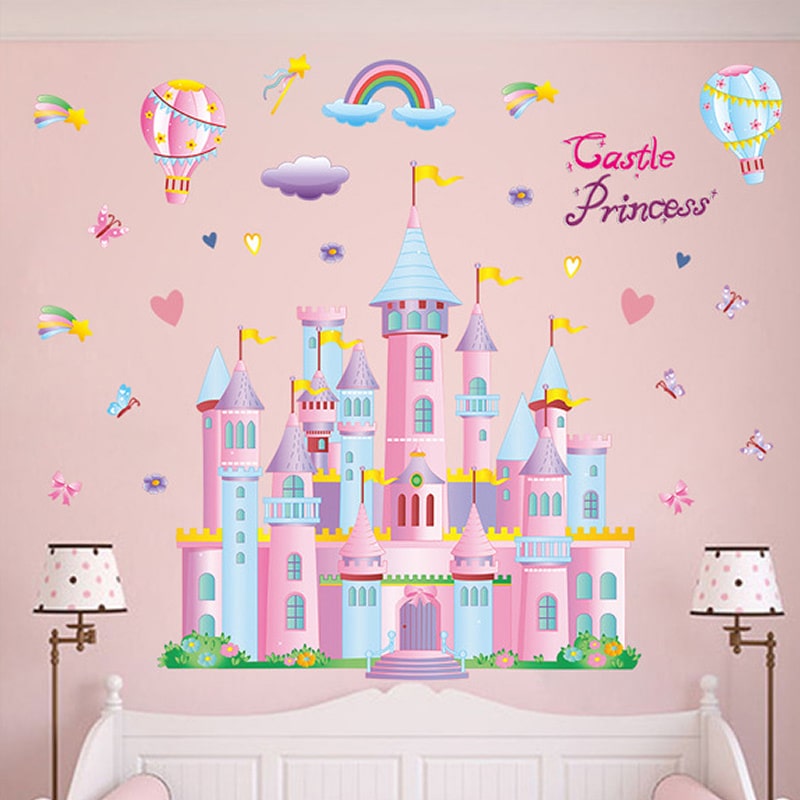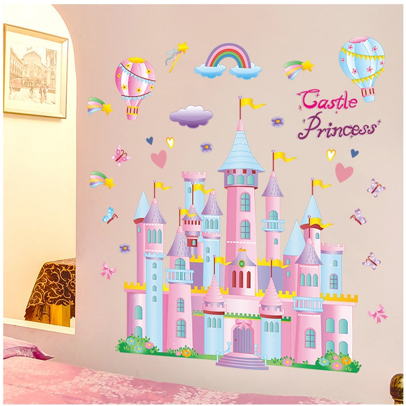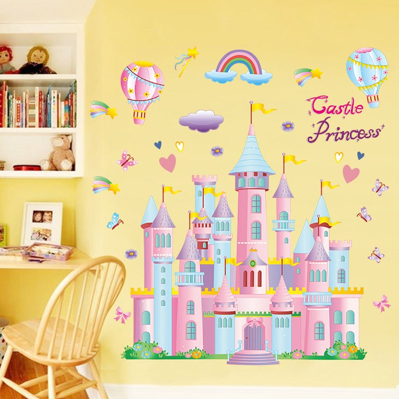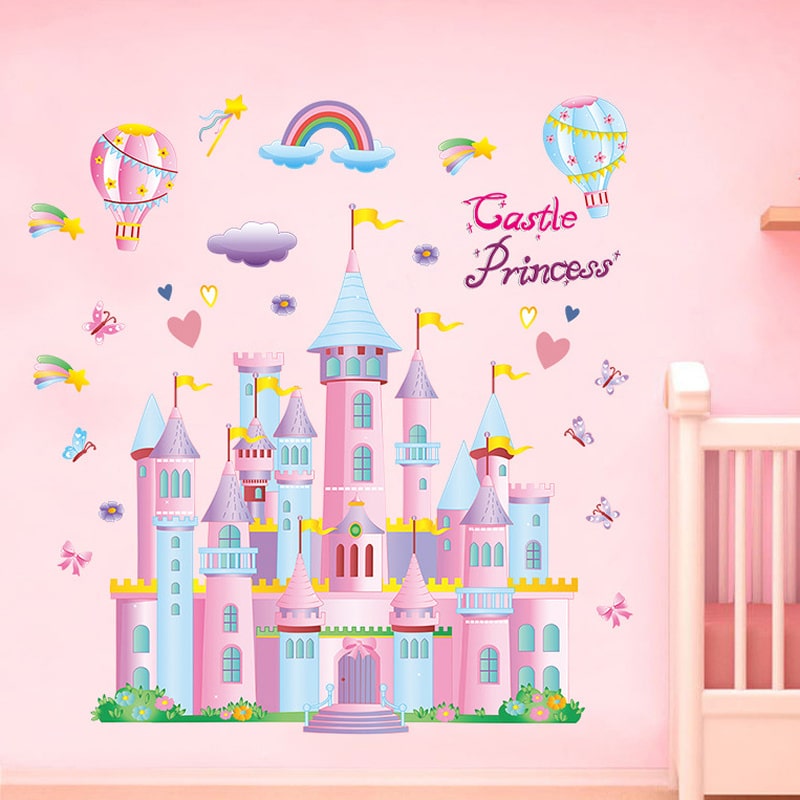 Rigtig sød wallsticker med et rigtig prinsesse slot med pomp og pragt med alt hvad der hører til, i flotte pastelfarver på 90x60cm.