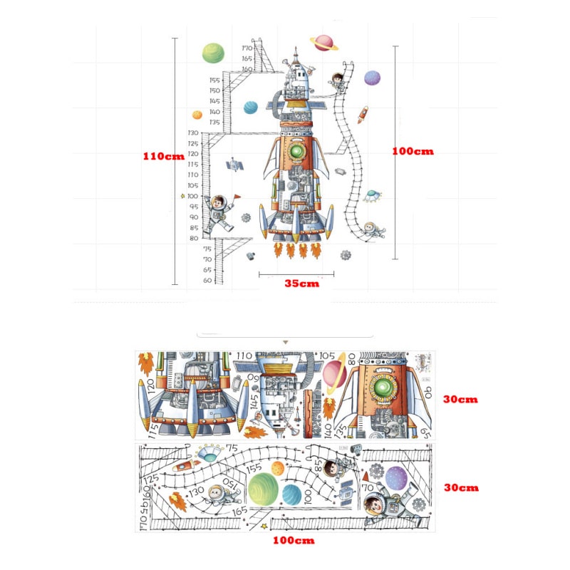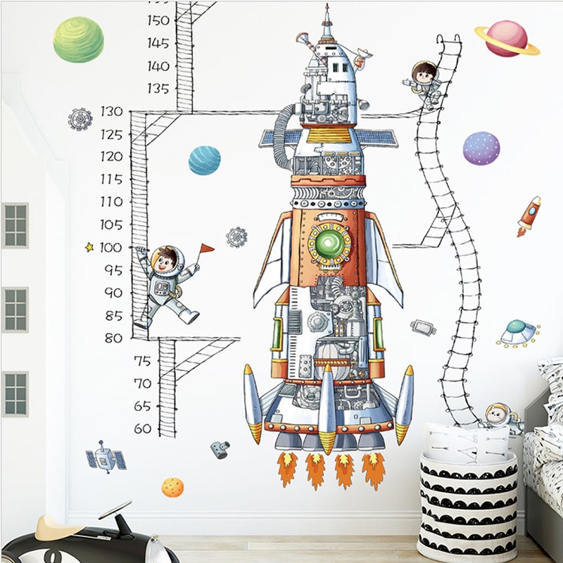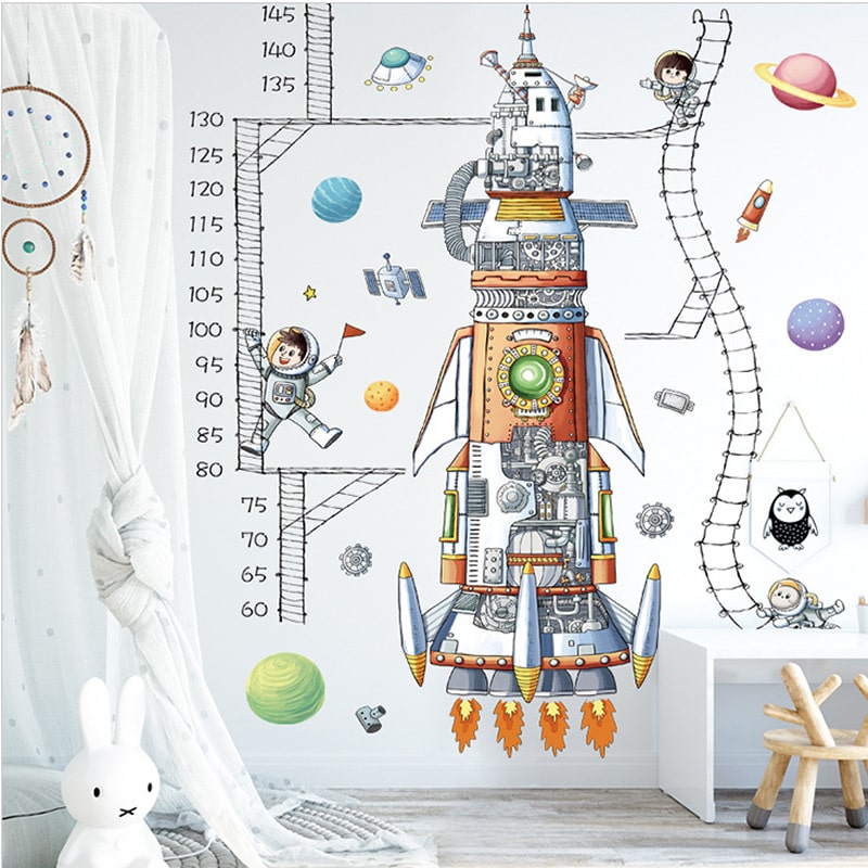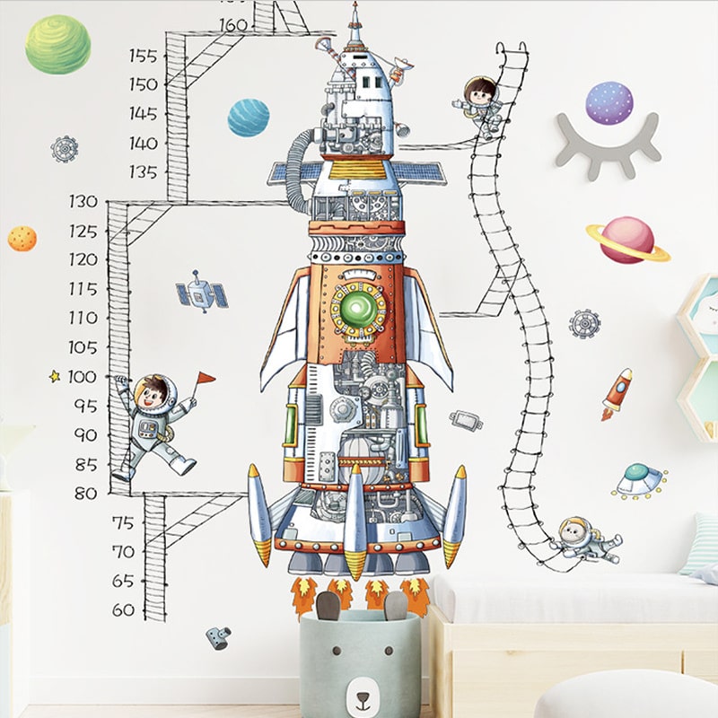 Flot, farverig og praktisk højdemåler wallsticker med et stort målebånd ved siden af en sej og cool rumraket.