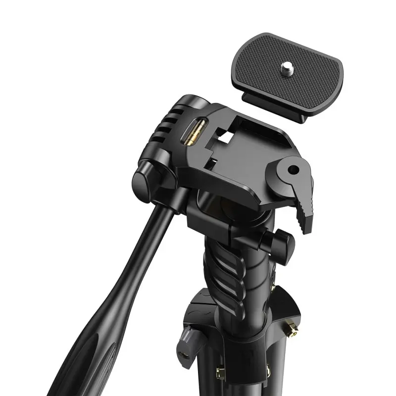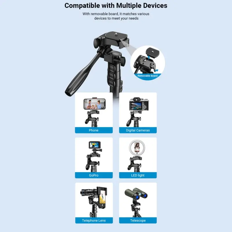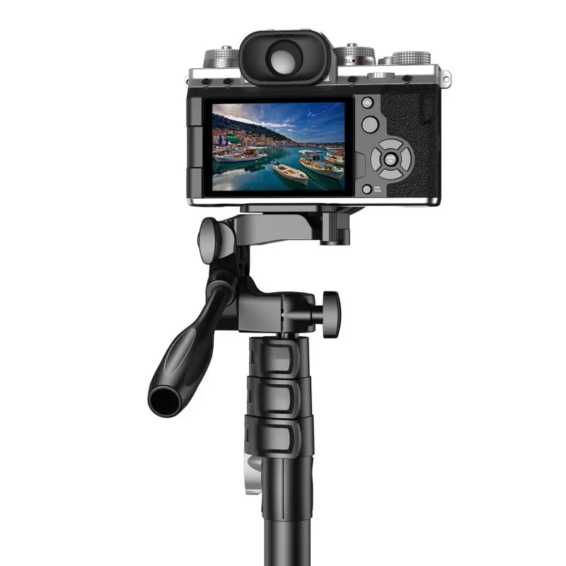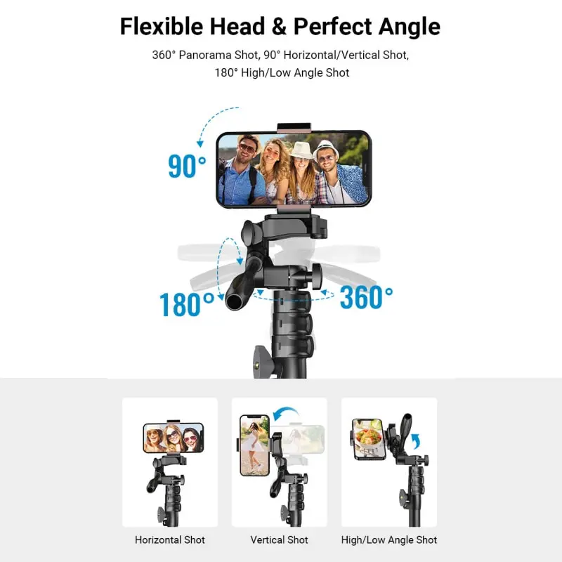 Derudover har dette kamera stativ også et 360°, 3-vejs justerbart panoreringshoved, så du kan tage det perfekte billede fra enhver vinkel.