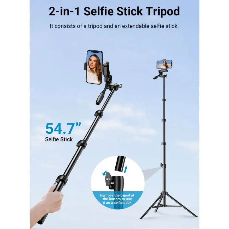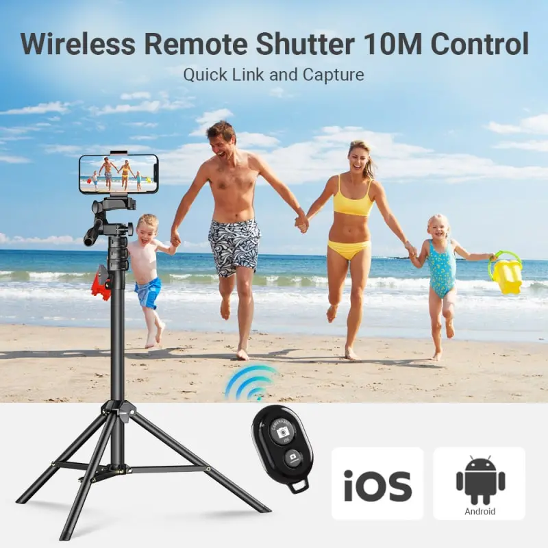Denne multifunktionelle Tripod Stativ og Selfie Stick indeholder en Bluetooth-fjernbetjening, der giver dig mulighed for at tage billeder og videoer fra op til 10m væk.