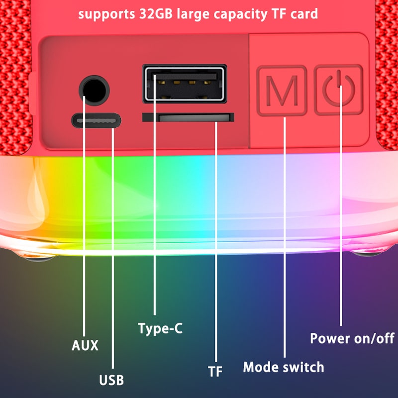 Derudover understøtter den trådløse højtaler USB, TF-kort og AUX-tilslutning for maksimal fleksibilitet.