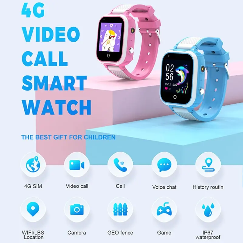 Lækkert børne smartwatch med 4G med masser af fede funktioner såsom GPS-positionering, LBS-positionering, WiFi-positionering, videoopkald, geo-hegn, tovejsopkald, IP67 vandtæt certificering, SOS, lommelygte, fotogalleri, telefonbog, stemmechatmonitor, ikke-forstyrre-funktion til skole, alarm, stop-ur, vækkeur, 7 sjove spil mm.