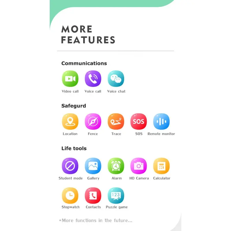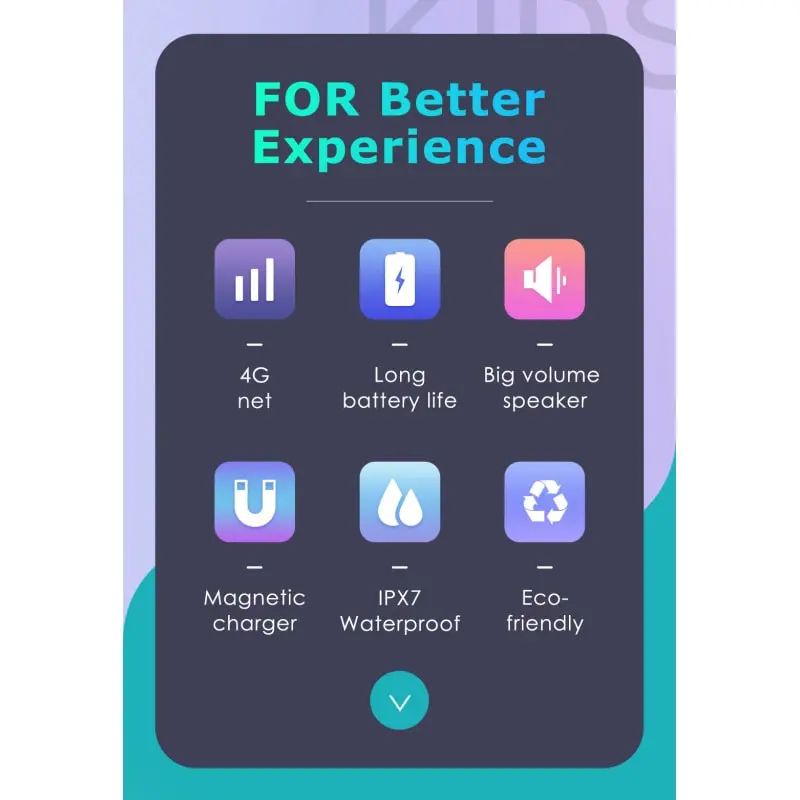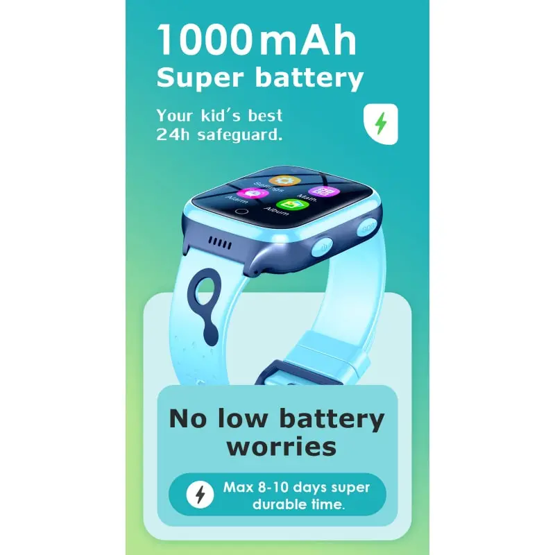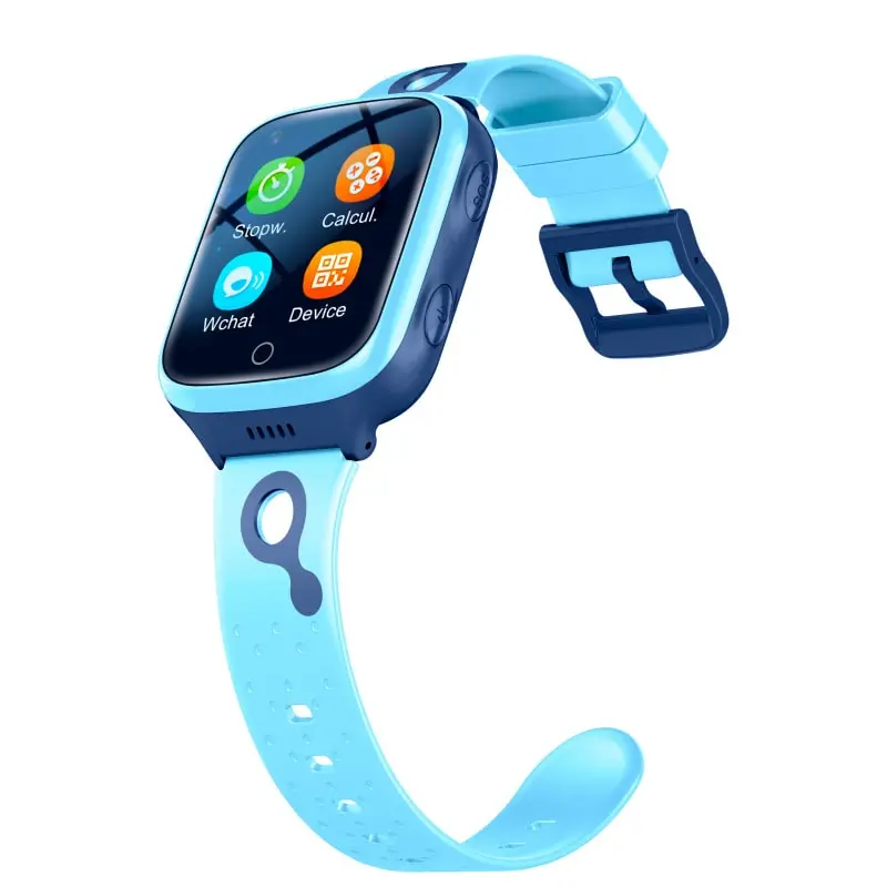 Lækkert børne smartwatch med 4G med masser af fede funktioner såsom GPS-positionering, LBS-positionering, WiFi-positionering, videoopkald, geo-hegn, videoopkald, tovejsopkald, IPX7 certificering, SOS, fotogalleri, telefonbog, stemmechatmonitor, ikke-forstyrre-funktion til skole, lommeregner, alarm, stop-ur, vækkeur, spil mm.